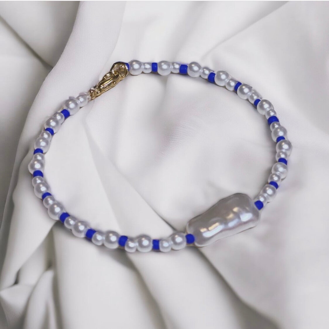fint hvidt armbånd med små mørkeblå perler og et flot hvedhæng på midten som er perfekt til både hværdag og fæstligelegligheder.